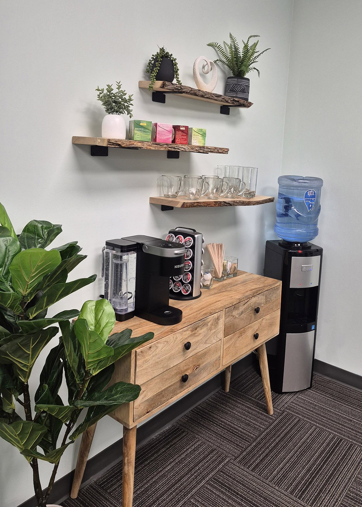 We’ve intentionally curated our spaces to help you feel at ease. When meeting with one of our therapists in person, the first space to welcome you is our waiting area. Please help yourself to something to drink and make yourself comfortable while waiting for your appointment. At your appointment time, your therapist will come to greet you and lead you back to a counselling room.